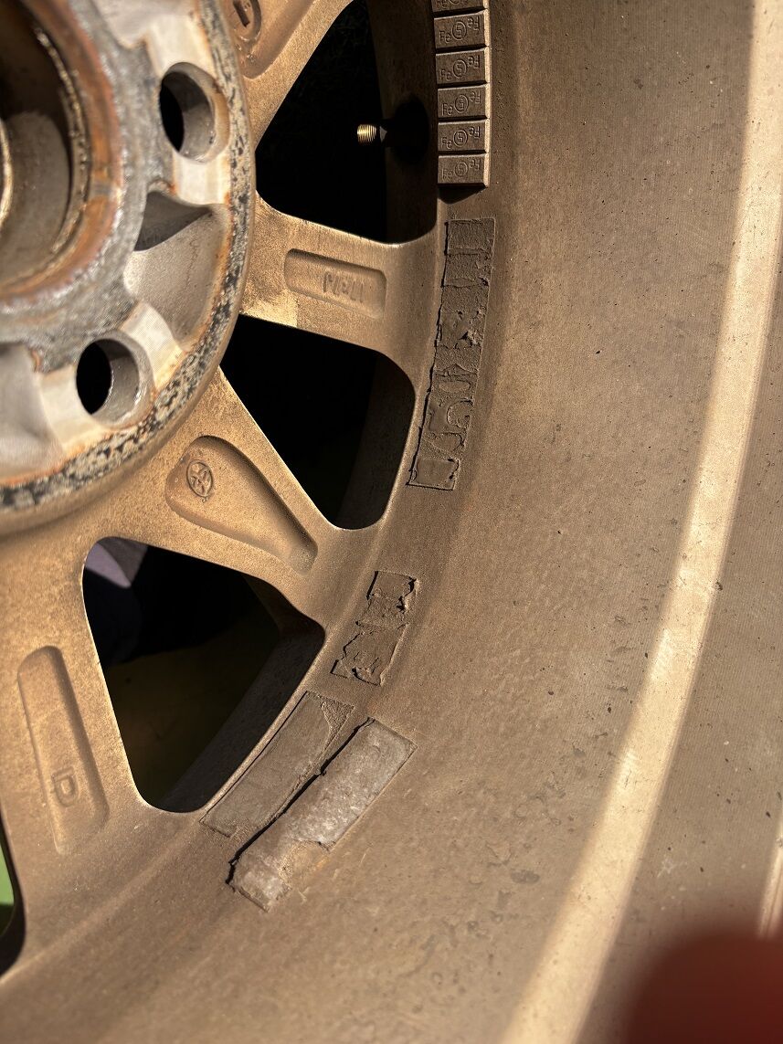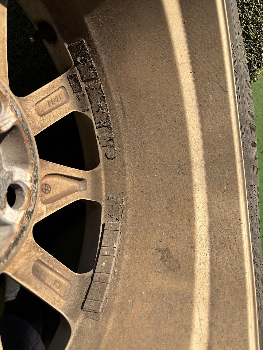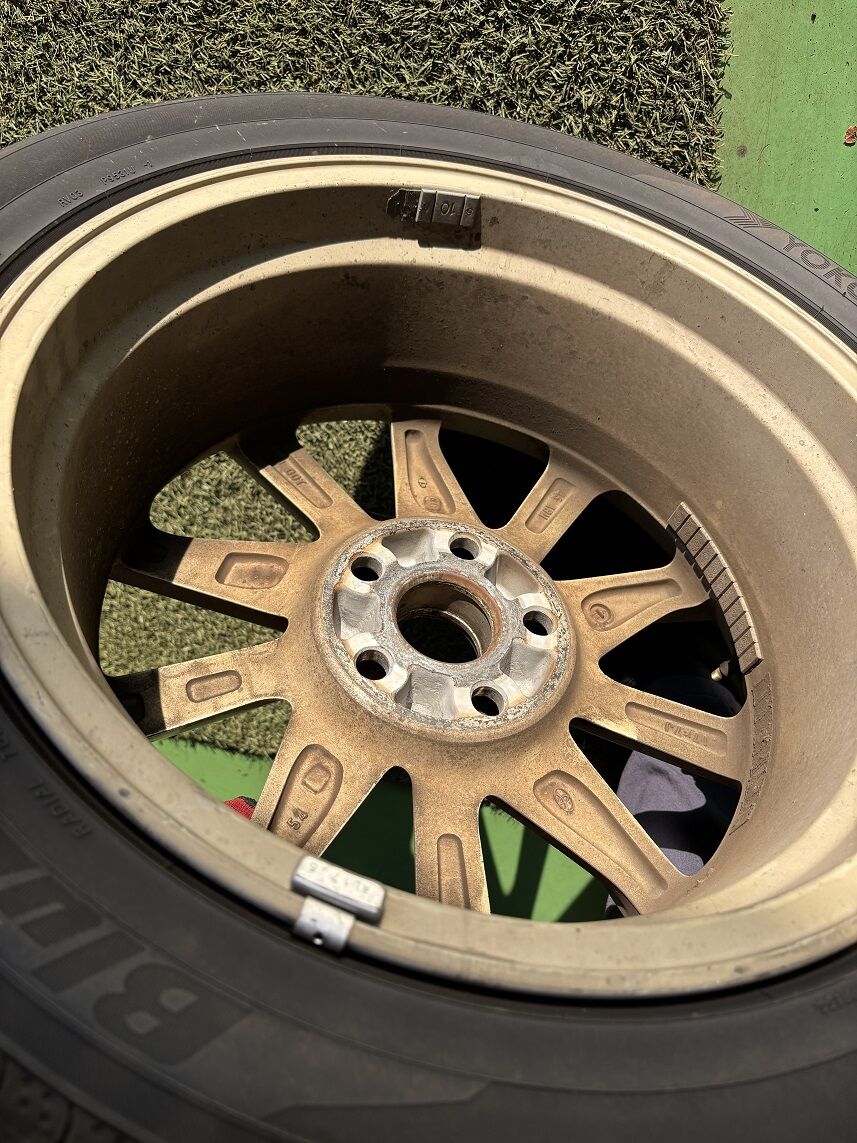 前回と前々回のタイヤ交換作業でバランスウェイトを剥がしたあとのノリ痕がそのままの状態&そのノリ痕の上に新しいバランスウェイトを貼り付ける&その内1本はバランスウェイトを剝がさずにそのままの状態で打ち込みウェイトを取り付け…と、酷い状態のホイール内側